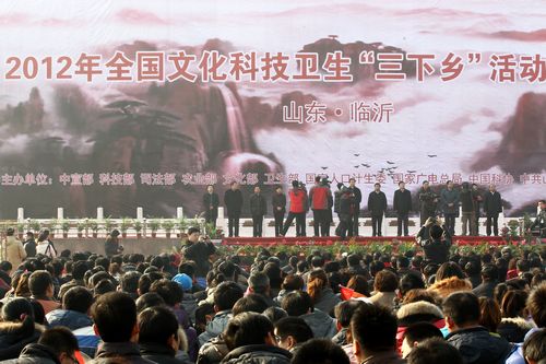日前,由中宣部、科技部、司法部、农业部、文化部、卫生部、国家人口计生委、国家广电总局、中国科协九部门和山东省委、省政府联合举办的全国文化科技卫生“三下乡”活动启动仪式和集中服务活动,在我省临沂市临沭县举行,标志着2012年全国“三下乡”活动拉开帷幕。中宣部副部长申维辰,科技部党组成员、科技日报社社长王志学,司法部党组成员、纪检组长韩亨林,农业部国家首席兽医师于康震,文化部党组成员、部长助理高树勋,卫生部副部长马晓伟,国家人口计生委副主任崔丽,国家广电总局副局长张丕民,中国科协党组成员、书记处书记徐延豪,省委常委、宣传部长孙守刚,副省长张建国,以及中央9部委有关司局、省直有关部门的负责同志,张少军、李建华等临沂市领导同志出席。申维辰主持并讲话,孙守刚致辞。