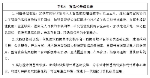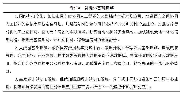 大力推动智能化信息基础设施建设,提升传统基础设施的智能化水平,形成适应智能经济、智能社会和国防建设需要的基础设施体系。加快推动以信息传输为核心的数字化、网络化信息基础设施,向集融合感知、传输、存储、计算、处理于一体的智能化信息基础设施转变。优化升级网络基础设施,研发布局第五代移动通信(5G)系统,完善物联网基础设施,加快天地一体化信息网络建设,提高低时延、高通量的传输能力。统筹利用大数据基础设施,强化数据安全与隐私保护,为人工智能研发和广泛应用提供海量数据支撑。建设高效能计算基础设施,提升超级计算中心对人工智能应用的服务支撑能力。建设分布式高效能源互联网,形成支撑多能源协调互补、及时有效接入的新型能源网络,推广智能储能设施、智能用电设施,实现能源供需信息的实时匹配和智能化响应。