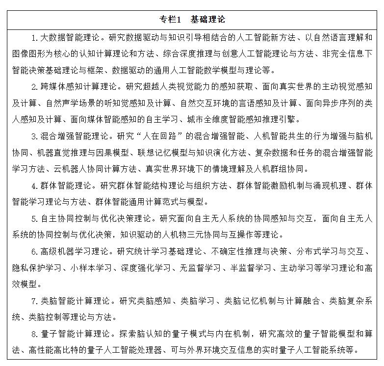 布局前沿基础理论研究。针对可能引发人工智能范式变革的方向,前瞻布局高级机器学习、类脑智能计算、量子智能计算等跨领域基础理论研究。高级机器学习理论重点突破自适应学习、自主学习等理论方法,实现具备高可解释性、强泛化能力的人工智能。类脑智能计算理论重点突破类脑的信息编码、处理、记忆、学习与推理理论,形成类脑复杂系统及类脑控制等理论与方法,建立大规模类脑智能计算的新模型和脑启发的认知计算模型。量子智能计算理论重点突破量子加速的机器学习方法,建立高性能计算与量子算法混合模型,形成高效精确自主的量子人工智能系统架构。