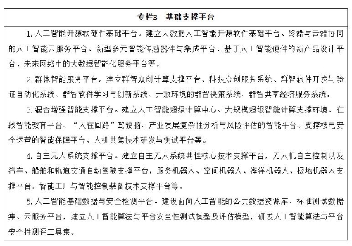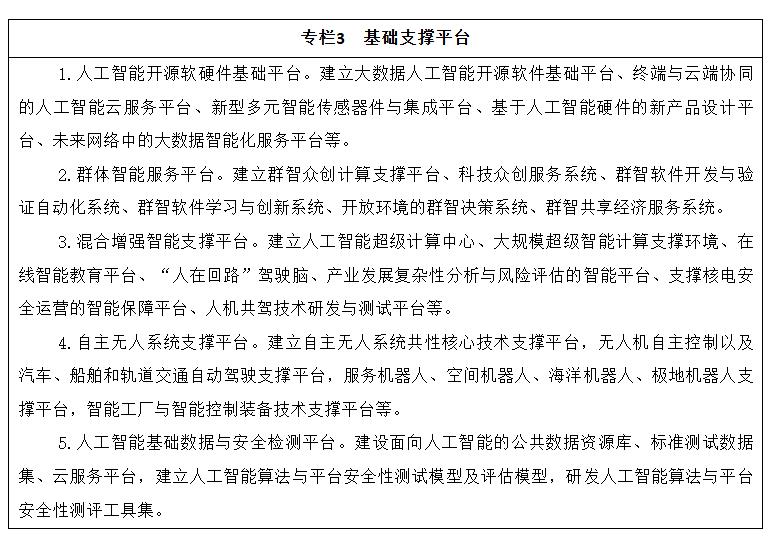 建设布局人工智能创新平台,强化对人工智能研发应用的基础支撑。人工智能开源软硬件基础平台重点建设支持知识推理、概率统计、深度学习等人工智能范式的统一计算框架平台,形成促进人工智能软件、硬件和智能云之间相互协同的生态链。群体智能服务平台重点建设基于互联网大规模协作的知识资源管理与开放式共享工具,形成面向产学研用创新环节的群智众创平台和服务环境。混合增强智能支撑平台重点建设支持大规模训练的异构实时计算引擎和新型计算集群,为复杂智能计算提供服务化、系统化平台和解决方案。自主无人系统支撑平台重点建设面向自主无人系统复杂环境下环境感知、自主协同控制、智能决策等人工智能共性核心技术的支撑系统,形成开放式、模块化、可重构的自主无人系统开发与试验环境。人工智能基础数据与安全检测平台重点建设面向人工智能的公共数据资源库、标准测试数据集、云服务平台等,形成人工智能算法与平台安全性测试评估的方法、技术、规范和工具集。促进各类通用软件和技术平台的开源开放。各类平台要按照军民深度融合的要求和相关规定,推进军民共享共用。