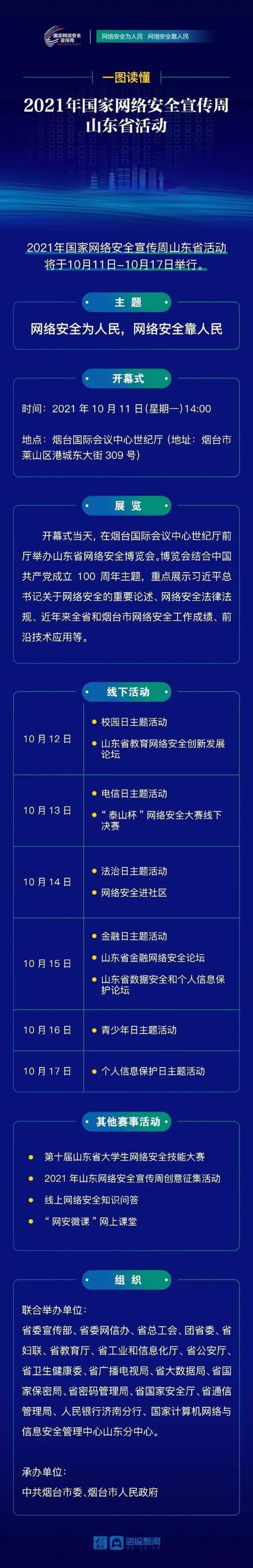 2021年国家网络安全宣传周山东省活动由省委宣传部、省委网信办、省总工会、团省委、省妇联、省教育厅、省工业和信息化厅、省公安厅、省卫生健康委、省广播电视局、省大数据局、省国家保密局、省密码管理局、省国家安全厅、省通信管理局、人民银行济南分行、国家计算机网络与信息安全管理中心山东分中心联合举办,中共烟台市委、烟台市人民政府承办。
