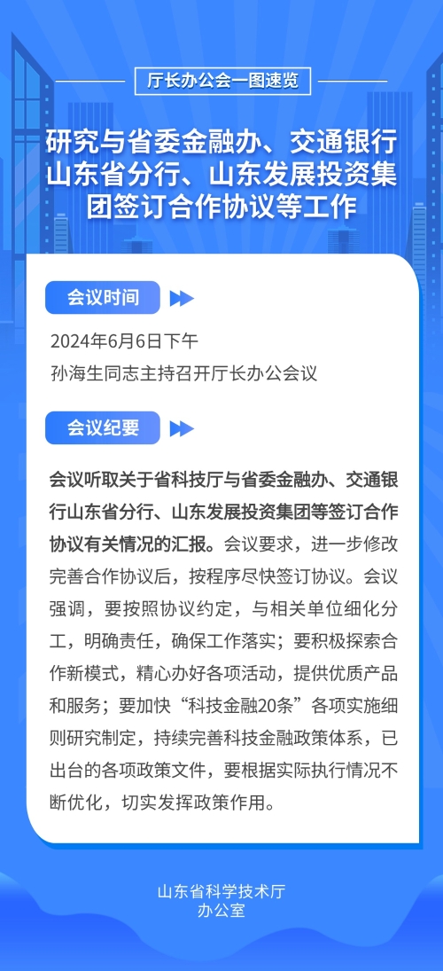 首页 >政务公开 >政府会议 >部门办公会议 会议图解 | 省科技厅厅长办公会研究与省委金融办、交通银行山东省分行、山东发展投资集团签订合作协议等工作 浏览次数: 信息来源:办公室 发布时间: 2024-06-12 11:01 文字大小: 大 中 小 【相关信息】部门办公会 | 省科技厅厅长办公会研究与省委金融办、交通银行山东省分行、山东发展投资集团签订合作协议等工作 打印 关闭