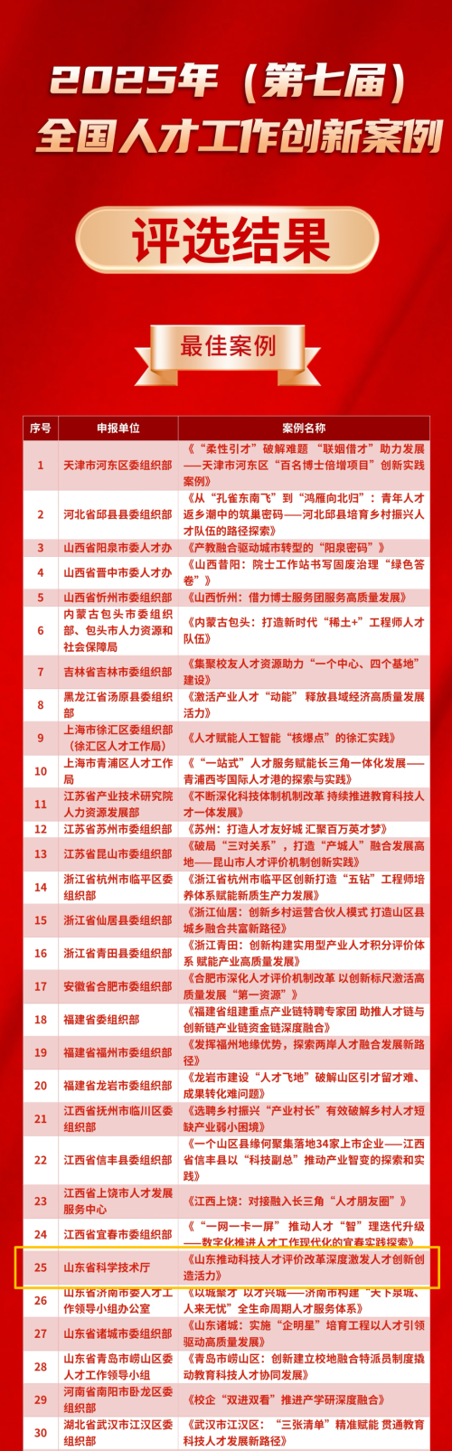 首页 >科技资讯 >工作动态 喜报 | 山东科技人才评价改革做法获评全国人才工作创新案例“最佳案例” 浏览次数: 信息来源:人才处、人才中心 发布时间: 2025-10-17 10:48 文字大小: 大 中 小 近日,2025年(第七届)全国人才工作创新案例评选结果揭晓。我厅报送的《山东推动科技人才评价改革 深度激发人才创新创造活力》获评全国“最佳案例”,此次获奖创新案例,正是我省在科技人才工作中持续创新、成效显著的生动示例。为更好展现各地各部门深入实施新时代人才强国战略、强化现代化建设人才支撑的实践成果,今年3月以来,中国人才杂志社举办了“2025年(第七届)全国人才工作创新案例征集评选活动”,共收到全国各级各部门报送的案例1200余篇,评出最佳案例50个、优秀案例100个。 打印 关闭