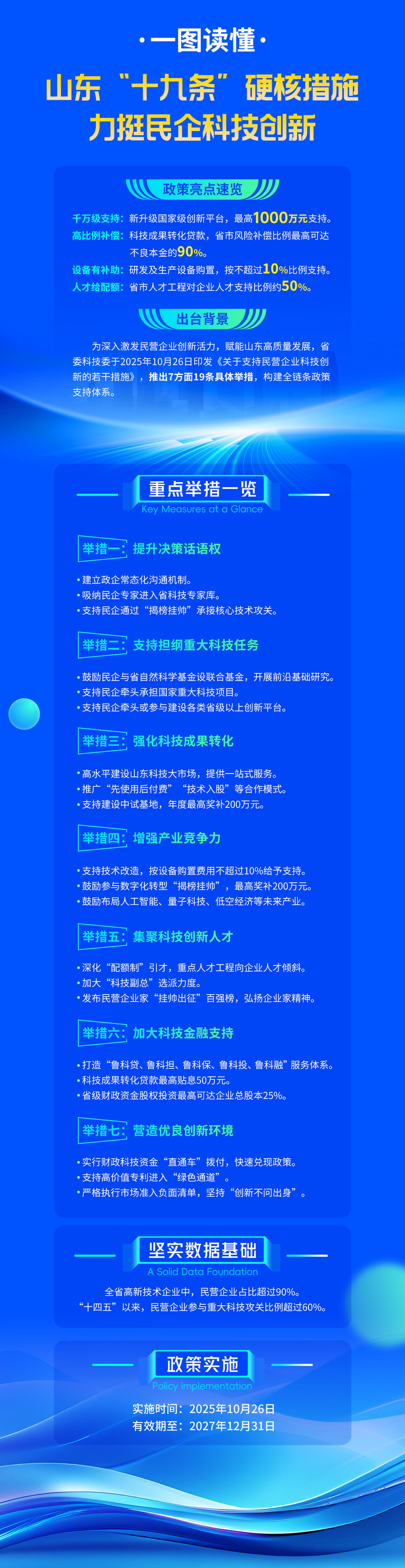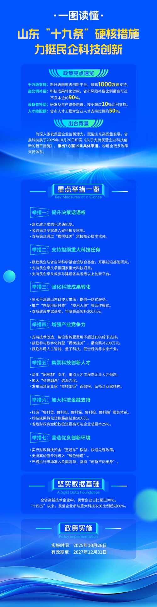首页 >政务公开 >法规文件 >政策解读 一图读懂 | 山东“十九条”硬核措施,力挺民企科技创新 浏览次数: 信息来源:大众报业·齐鲁壹点 发布时间: 2025-11-11 17:27 文字大小: 大 中 小 相关政策:关于印发《关于支持民营企业科技创新的若干措施》的通知 打印 关闭