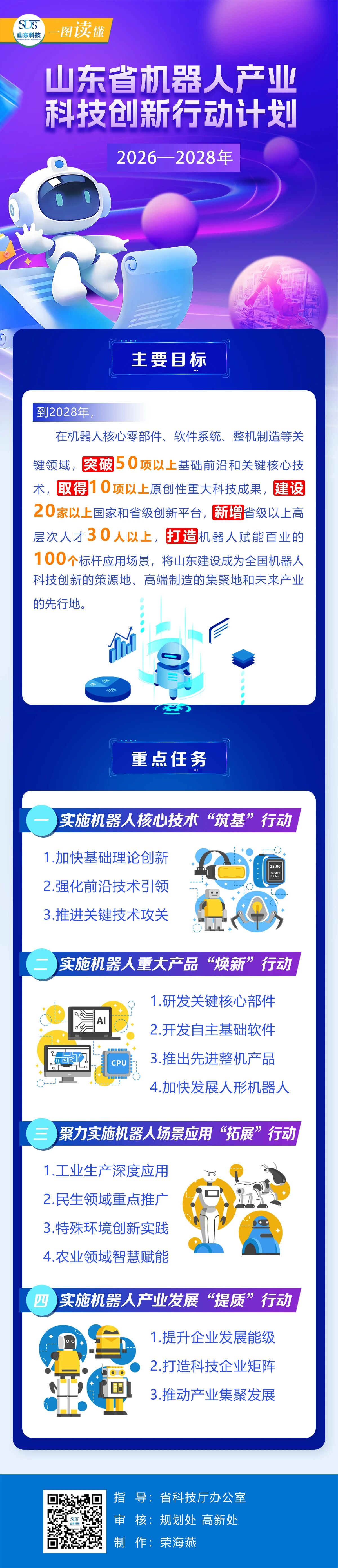 首页 >政务公开 >法规文件 >政策解读 一图读懂 | 《山东省机器人产业科技创新行动计划(2026—2028年)》 浏览次数: 信息来源:山东科技 发布时间: 2025-11-08 13:52 文字大小: 大 中 小 相关政策:关于印发《山东省机器人产业科技创新行动计划(2026—2028年)》的通知 打印 关闭