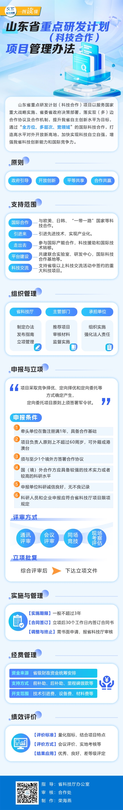 首页 >政务公开 >法规文件 >政策解读 一图读懂 | 《山东省重点研发计划(科技合作)项目管理办法》 浏览次数: 信息来源:办公室 发布时间: 2025-02-25 15:59 文字大小: 大 中 小 相关政策:关于印发《山东省重点研发计划(科技合作)项目管理办法》的通知 打印 关闭