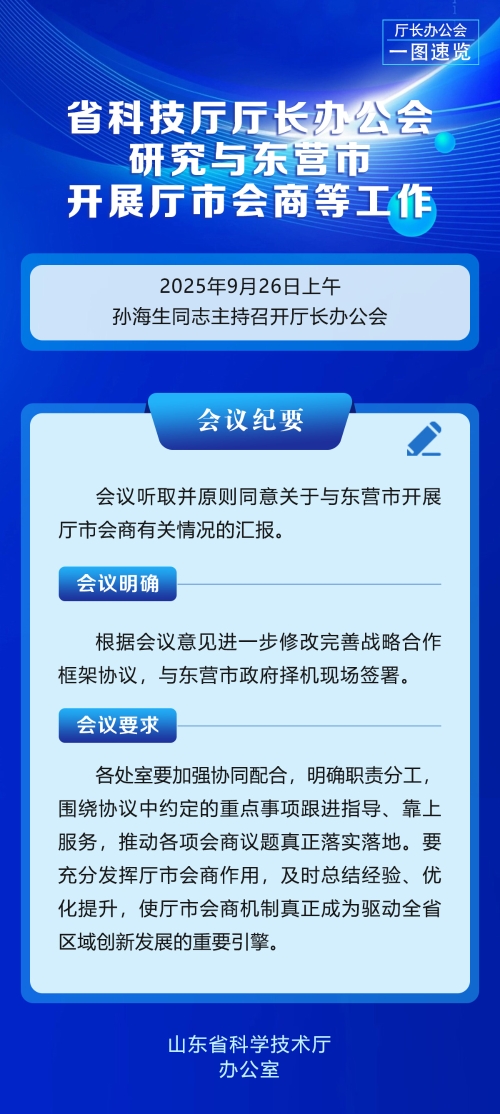 首页 >政务公开 >政府会议 >部门办公会议 会议图解 | 省科技厅厅长办公会研究与东营市开展厅市会商等工作 浏览次数: 信息来源:办公室 发布时间: 2025-09-29 09:57 文字大小: 大 中 小 【相关信息】办公会 | 省科技厅厅长办公会研究与东营市开展厅市会商等工作 打印 关闭
