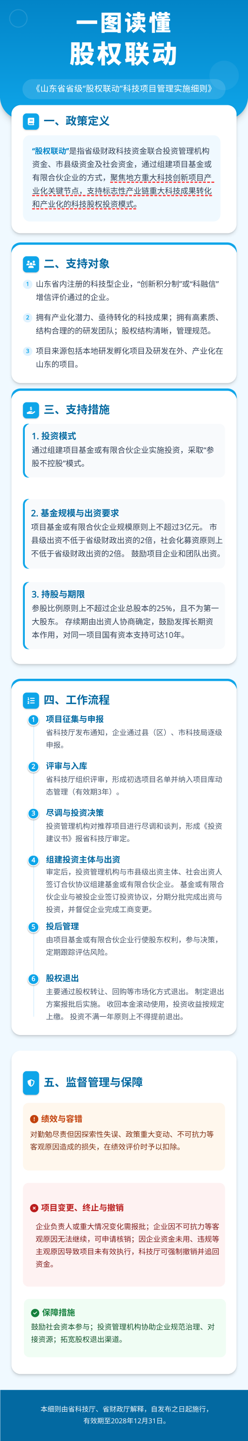 首页 >政务公开 >法规文件 >政策解读 一图读懂 | 《山东省省级“股权联动”科技项目管理实施细则》 浏览次数: 信息来源:资配处 发布时间: 2026-01-02 11:39 文字大小: 大 中 小 有关政策:关于印发《山东省省级“股权联动”科技项目管理实施细则》的通知 打印 关闭