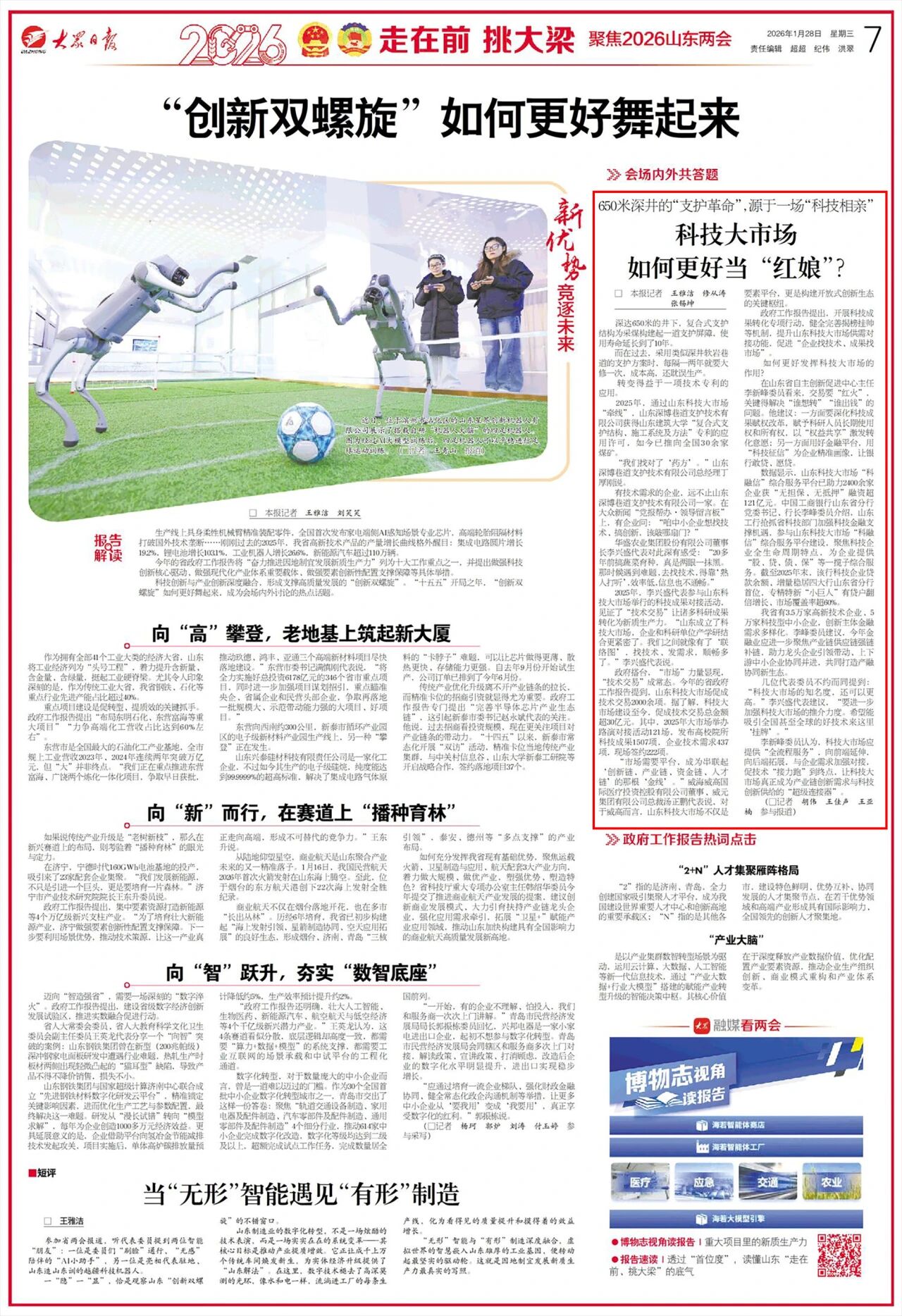 数据显示,山东科技大市场“科融信”综合服务平台已助力2400余家企业获“无担保、无抵押”融资超121亿元。中国工商银行山东省分行党委书记、行长李峰委员介绍,山东工行抢抓省科技部门加强科技金融支撑机遇,参与山东科技大市场“科融信”综合服务平台建设,聚焦科技企业全生命周期特点,为企业提供“股、贷、债、保”等一揽子综合服务。截至2025年末,该行科技企业贷款余额、增量稳居四大行山东省分行首位,专精特新“小巨人”有贷户翻倍增长、市场覆盖率超60%。