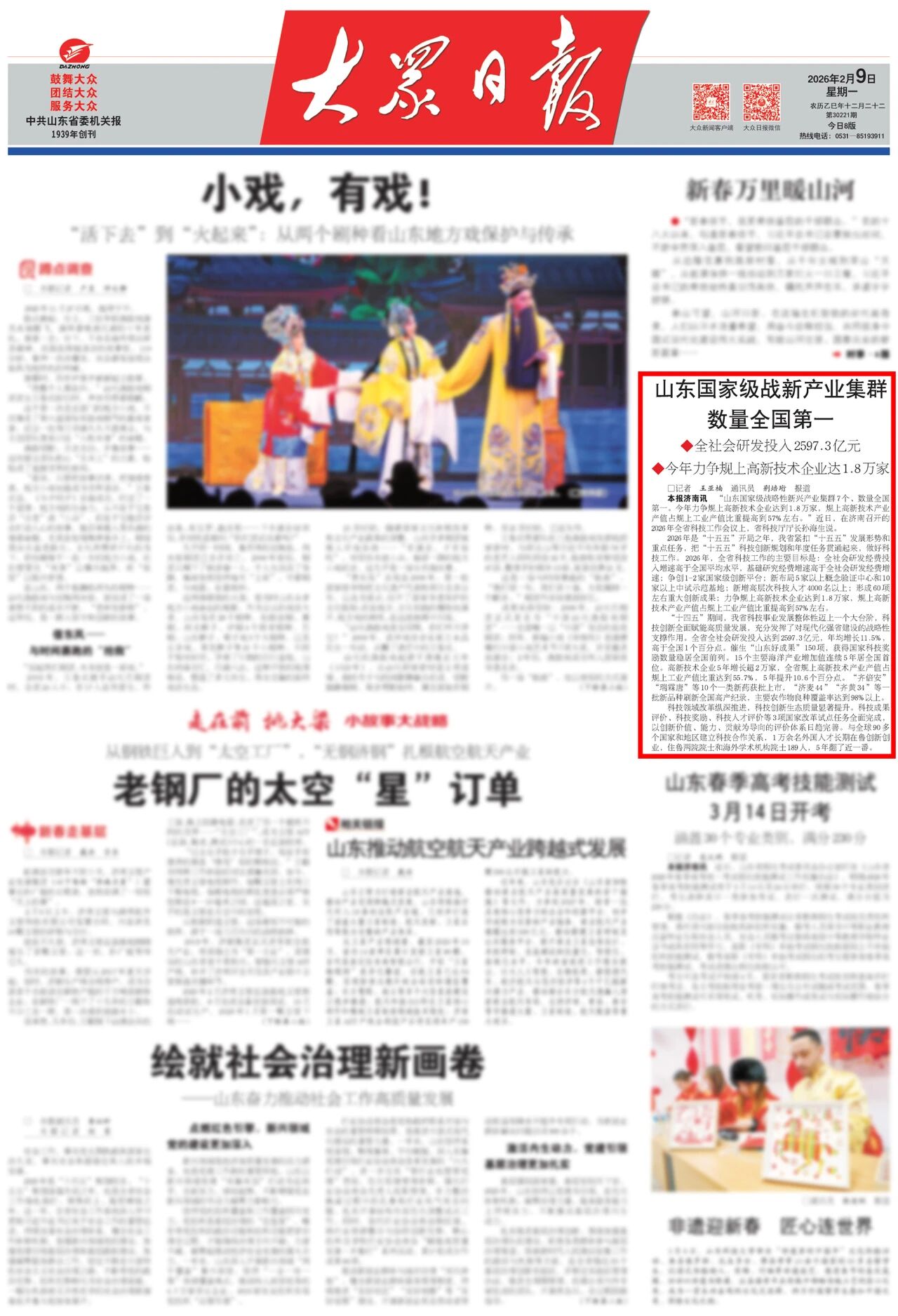 “山东国家级战略性新兴产业集群7个、数量全国第一。今年力争规上高新技术企业达到1.8万家,规上高新技术产业产值占规上工业产值比重提高到57%左右。”近日,在济南召开的2026年全省科技工作会议上,省科技厅厅长孙海生说。