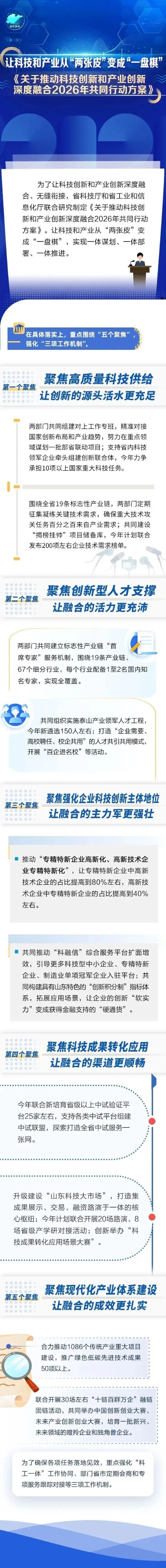 首页 >政务公开 >法规文件 >政策解读 一图读懂 | 科技创新和产业创新深度融合“一盘棋”,山东这样干→ 浏览次数: 信息来源:山东发布 发布时间: 2026-04-08 10:30 文字大小: 大 中 小 4月8日上午,山东省人民政府新闻办公室举行“干事创业 担当尽责”主题系列新闻发布活动,邀请省科技厅主要负责同志等介绍山东实行“科工一体”,推动科技创新与产业创新深度融合情况。相关政策:关于印发《关于推动科技创新和产业创新深度融合2026年共同行动方案》的通知 打印 关闭
